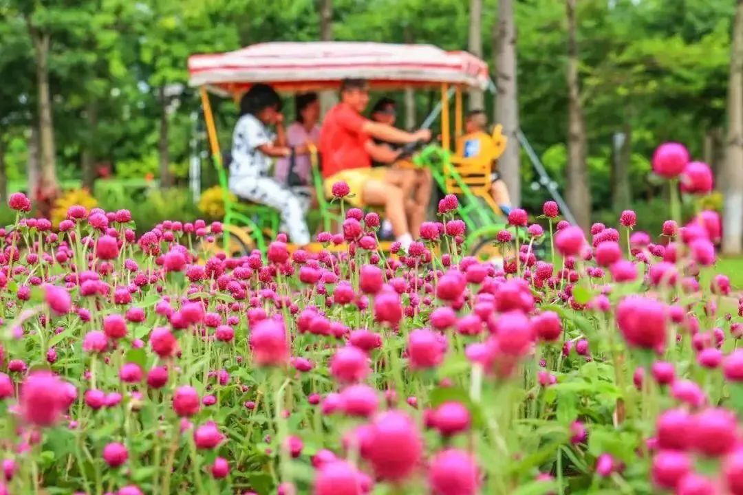 五彩斑斕的時(shí)花在花圃中呈現(xiàn)出一幅拼接的撞色彩繪,蜂飛蝶舞,盎然生趣。濱海堤岸景觀帶上一片繁花似錦、姹紫嫣紅。游人在此散步、騎行、拍照打卡,愜意萬分。