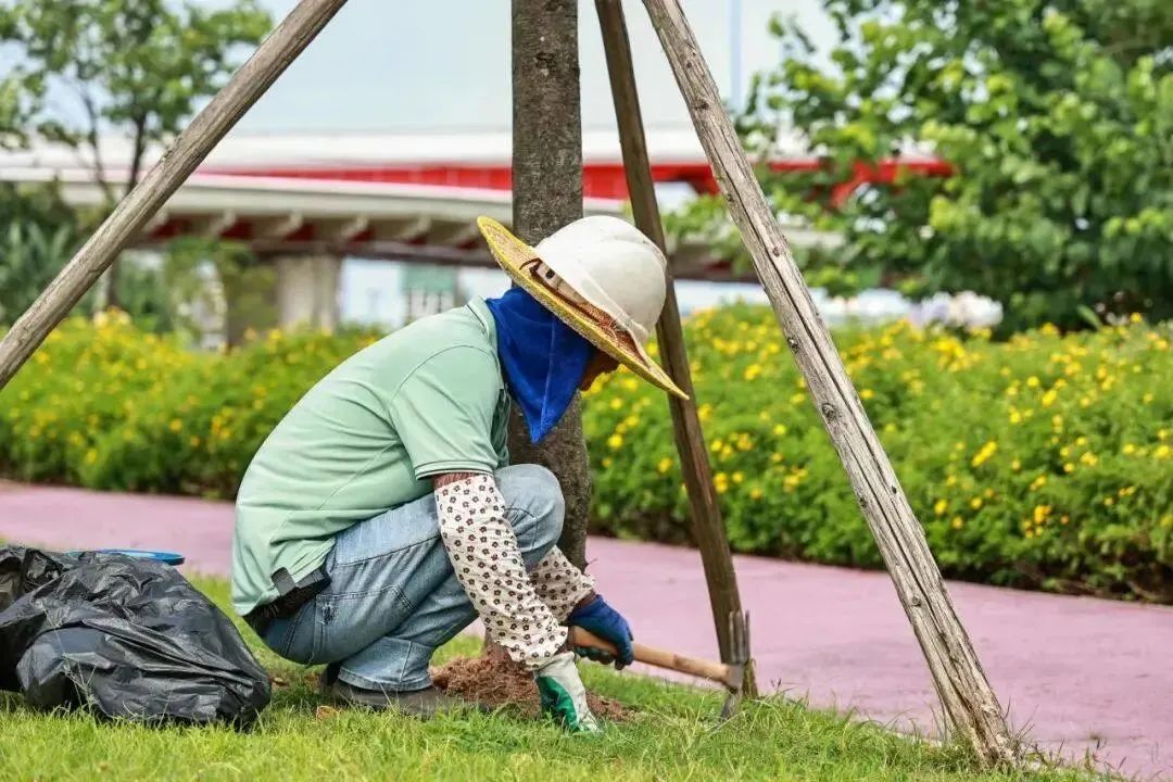 今年三月,琴建公司就對(duì)花海長廊三大開花喬木景觀區(qū)開始了樹盤梳理、打孔施肥、噴淋系統(tǒng)修復(fù)等工作,在樹木管養(yǎng)上做到未雨綢繆,在病蟲害防治等日常養(yǎng)護(hù)工作之外,提前檢查樹枝生長情況、及時(shí)修剪清理枯枝,防止枯枝掉落砸傷游人,有效預(yù)防并減少臺(tái)風(fēng)傷害。