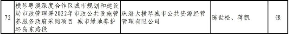 喜訊,2023年度,廣東省風景園林與生態(tài)景觀協(xié)會科學技術獎(園林工程獎)評選日前落幕,珠海大橫琴城市公共資源經營管理有限公司(以下簡稱大橫琴城資)管養(yǎng)的橫琴粵澳深度合作區(qū)城市規(guī)劃和建設局市政管理署2022年市政公共設施管養(yǎng)服務政府采購項目——城市綠地養(yǎng)護環(huán)島東路段榮獲養(yǎng)護類銀獎。