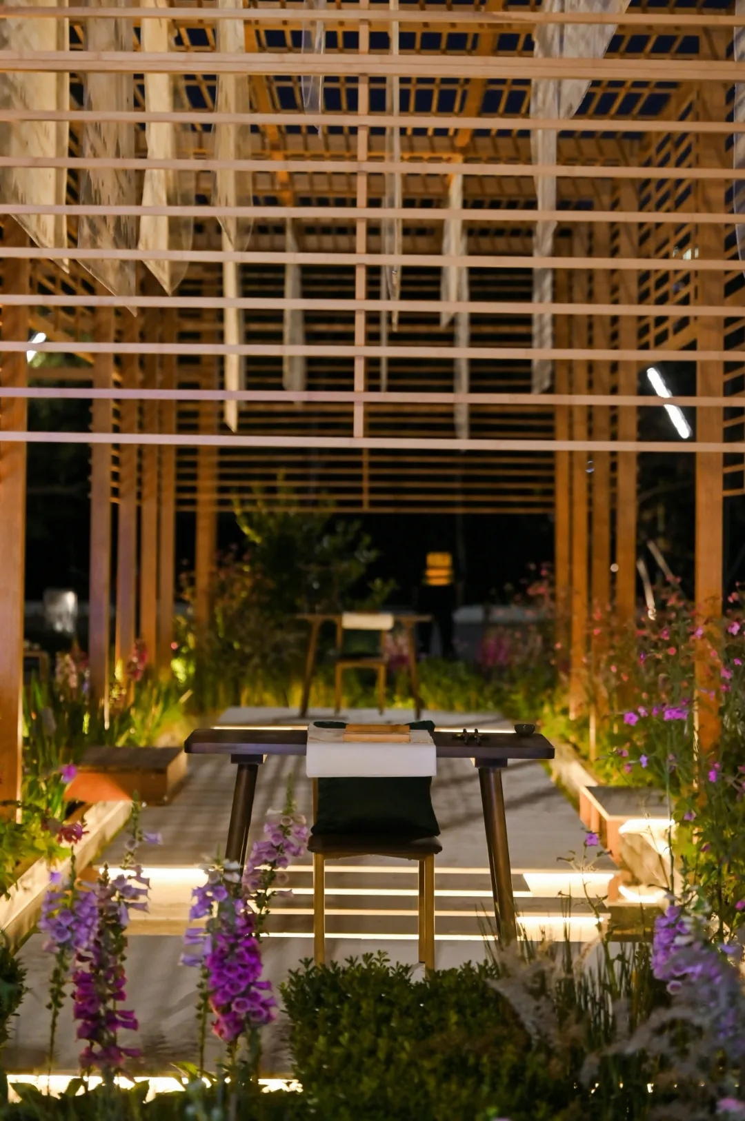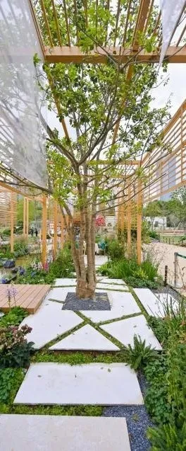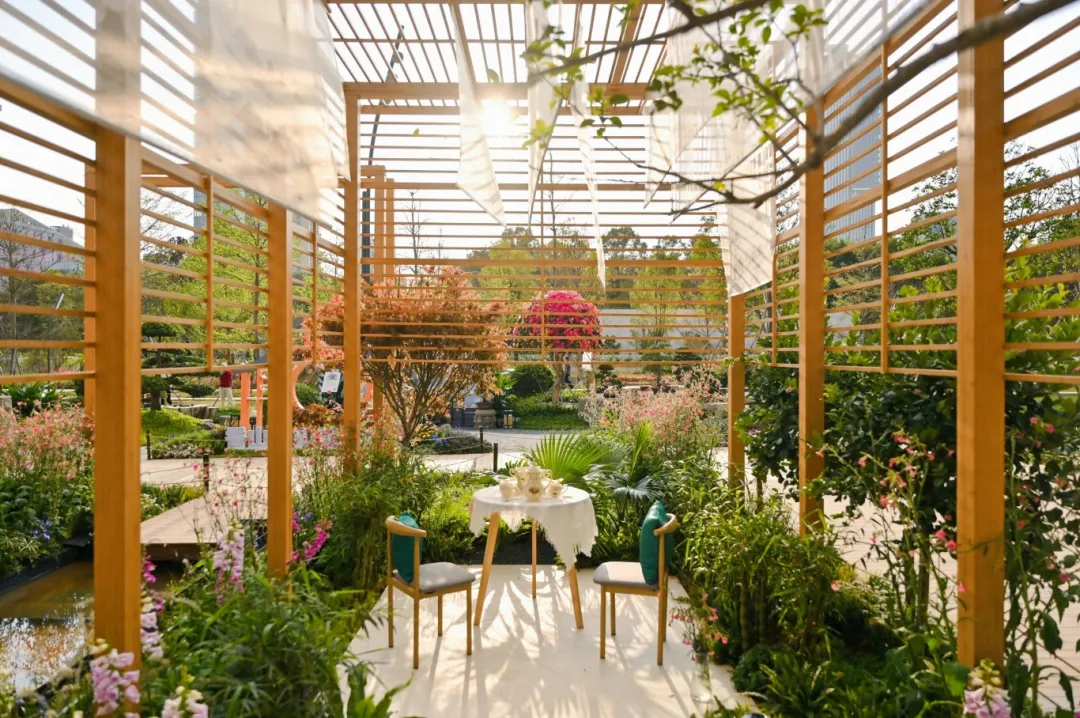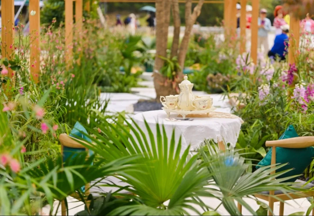 樹(shù)影婆娑,花香四溢,檸檬草、龍井茶、毛尖、柑橘、迷迭香等香草類(lèi)植物,洋溢著沁人的花草清香,與茶文化主題交織呼應(yīng)。