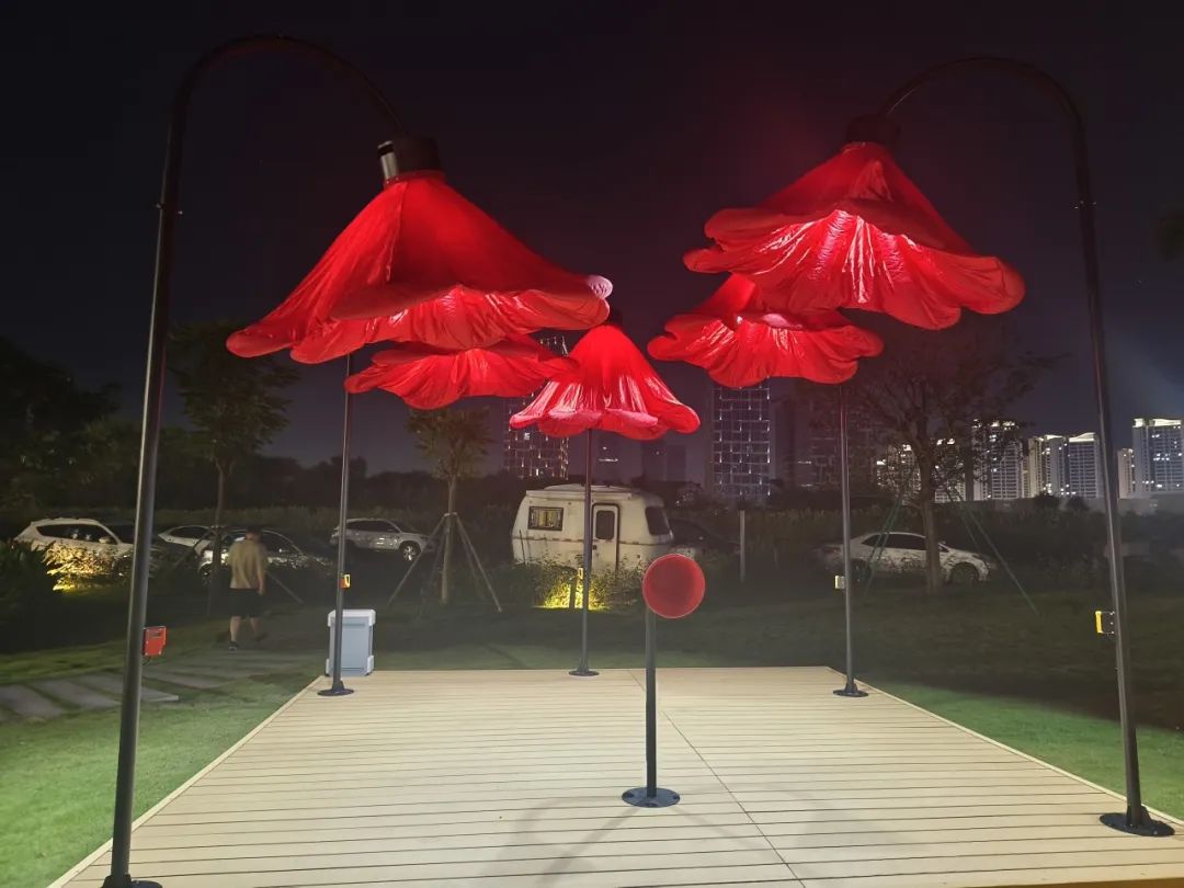 橫琴生態(tài)澤園的創(chuàng)意燈飾以含苞待放的喇叭花為主體造型,花朵使用充氣物料制成,內部藏有感應器。