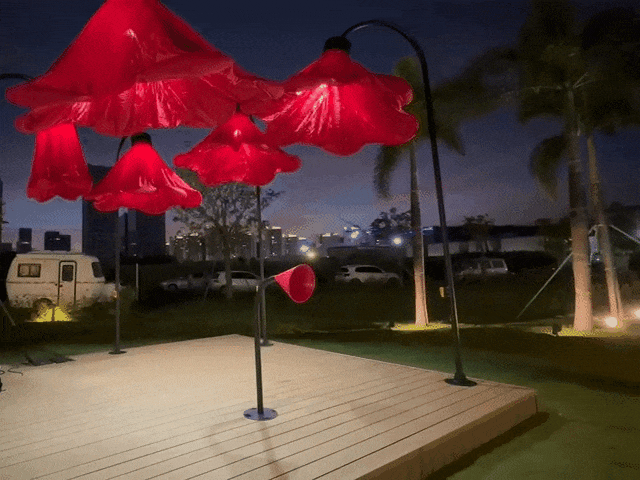 夜晚,當游人經(jīng)過,在喇叭裝置處說出“熱烈慶祝中華人民共和國成立75周年”、“熱烈慶祝澳門回歸祖國25周年”等祝福語時,花朵會自動打開并亮燈,創(chuàng)造出驚喜的互動體驗。